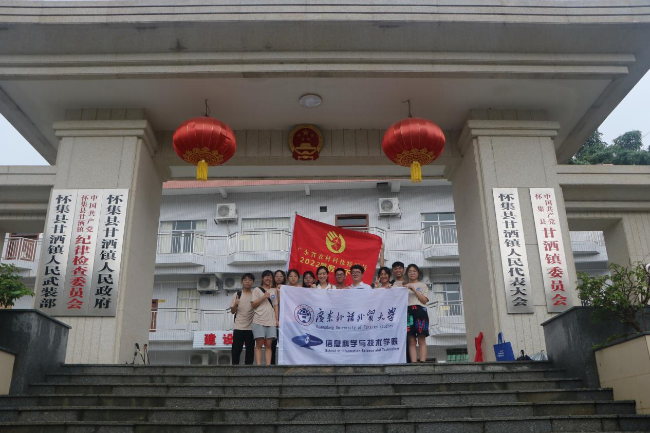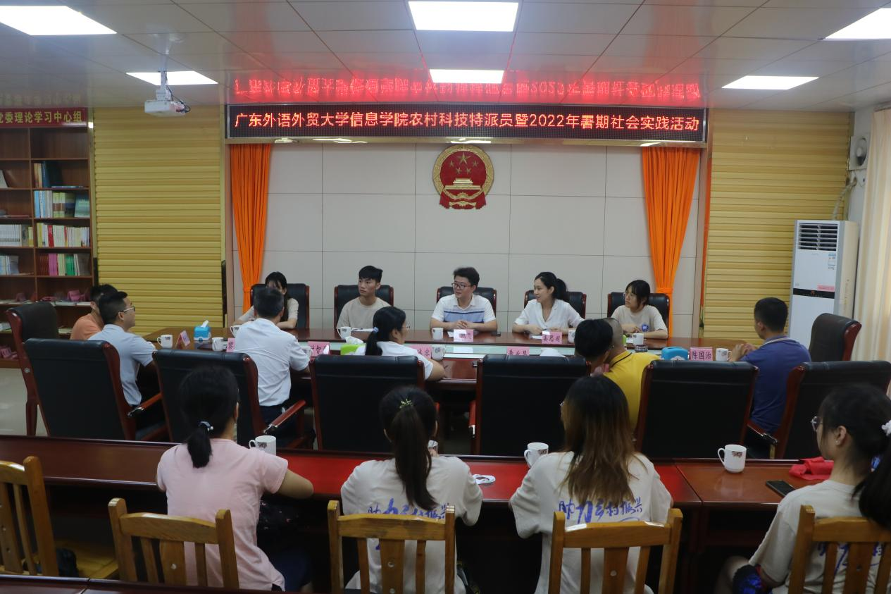 本网讯 7月4日下午,在广东外语外贸大学信息科学与技术学院/网络空间安全学院团委书记宋鹏飞老师、广东省科技下乡特派员姜思羽老师的带领下,信息学院鸿兴砚都队赶赴广东省肇庆市怀集县甘洒镇,开展大学生暑期“三下乡”社会实践活动,与甘洒镇政府干部们展开亲切友好的座谈会。