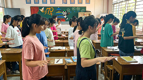 在向揭西县东园中学的教师了解到学生们对音乐的喜爱之后,实践团成员们增加了《一起向未来》手语操表演和广外学子改编版歌曲《银河与星斗》的教学,让孩子们与音乐相伴,打造轻松又充满活力的课间时光。《一起向未来》歌曲传递信心和希望,引导同学们团结友爱,而《银河和星斗》则是由队员重新填词,以“党的初心在感召”、“明德至善是我们的做人之道”等歌词,在潜移默化之中引导学生向前看,向党学,向善行。