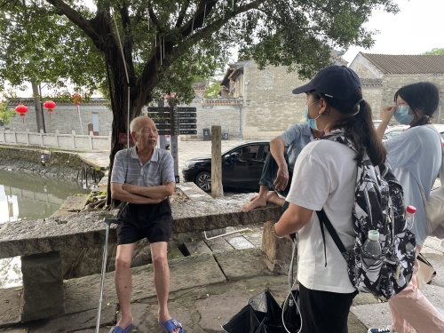 本网讯 7月12日上午,广东外语外贸大学新闻与传播学院“想不到响亮的名字队”一行人赴大岭村开展暑期调研活动,队员们参观大岭村著名历史建筑,前往非遗展馆街道了解非遗保护状况,采访附近村民关于大岭村的文化发展状况。