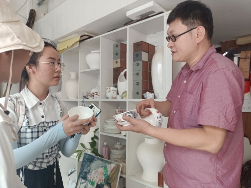 “大岭村的居住环境是我见过村落里做得最好的,因为大岭村远离市区的喧嚣,不少手艺人们入驻大岭村,入驻这里的不仅有蓝染,还有核雕、奇石、海瓷等。”张娟娟师傅说道。随后她向队员们介绍了豪石堂的豪师傅。豪师傅收集了世界各地的千奇百怪的石头,石头形态各异,奇石之奇名不虚传;在平核堂,队员们见证了如《核舟记》中核舟般的精美核雕;海瓷馆贝壳制作的瓷器敲打声轻灵传远,透光率极高。制作瓷画的师傅告诉队员们,陶和瓷,一千三百摄氏度是分界点,因为古代的早期达不到一千三百摄氏度,所以瓷是后来才发现并投入生产的。瓷器上的花纹图案由师傅一笔一画绘制而成,精致秀气,玲珑巧致。