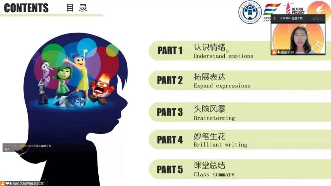 为牢牢抓住学生注意力,提高学生学习兴趣,展现广东外语外贸大学的外语特色,Torch义教队设计“Secret Agent of Art”的英语课堂为开班后的第一堂课。该课程以《头脑特工队》电影为背景,帮助学生掌握有关情绪的英语表达与写作。课堂上,学生认真听讲,积极参与课堂互动,踊跃回答老师提出的问题。课后也能积极完成课后作业与反馈问卷。任课老师单佳盈表示:“作为开启本次义教第一堂课的任课老师,我又紧张又兴奋。从教案修改,课件完善到线上授课,都想要做得更好,再好一些……非常开心能够和同学们完成这一堂课。”佳盈老师还发现,有不少同学对英语感兴趣,并且已经在本节课中崭露头角,表现出色。希望每位同学都能在为期七天的课程中找到自己的学科爱好,享受汲取知识的乐趣。