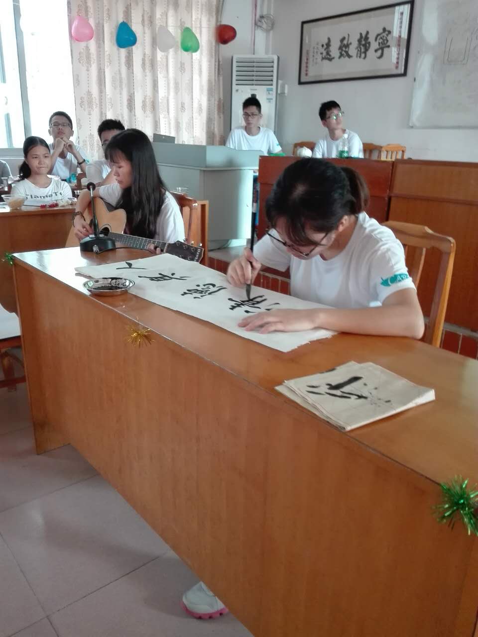 万事开头难,对于V-care与孩子们第一次的见面,最难的莫过于打破陌生人之间的隔膜。对此,文宣组的成员不但安排了队员的热场表演,有热舞,清唱,吉他伴奏,书法表演,还有互动游戏击鼓传花,报数抱团等。以表演开头,一对多的热场模式逐渐转换到多对多的游戏互动模式,不断拉近队员与孩子们的距离,到结束时,大家已经打成一团,迎新会破冰,我们做到了。