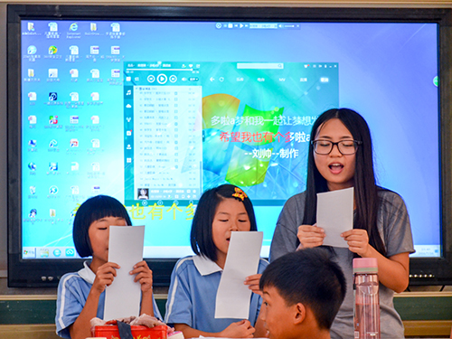 音乐课和舞蹈课是课程里不可或缺的艺术课。在义教二班的音乐课上,小朋友们先看到的不是歌词,而是《哆啦A梦》的动画。原来这节音乐课要学习的歌曲就是这部动画的主题曲。因为这是小朋友熟悉喜爱的歌曲,所以许多小朋友听了第一遍就能跟唱,他们稚嫩的声音配上轻快的歌曲,音乐课成为了最可爱的课。