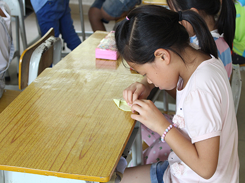 同样由文宣组负责的手工特色课由侯凤仪老师主讲,轻松愉快。小朋友们在拿到自己喜欢颜色的纸张后,就开始跟着凤仪学习小纸船的折法。刚开始的步骤只是简单的对折,小朋友很快就学会了。但是到了后面,随着折痕越来越多,他们不能顺利地找到折纸的地方和方向,有点摸不着头脑,但还是自己动脑解决了遇到的问题。到最后,纸船需要将原先折好的部分从里向外翻出来,这下难倒了不少小朋友。不过,在助教老师的帮助下,每个小朋友都得到了属于的小纸船。