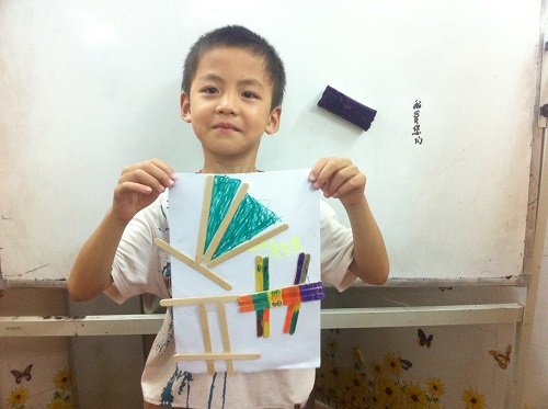 在下午的“冰棍制作”活动课堂中,孩子们彼此借鉴创作灵感,共同分配制作工具。在每组一助教,各助教互相机动协调的模式中,队员和孩子们经过五天的教学相长,孩子们争抢工具,随意自取活动材料的现象已经大大减少。不少的孩子已经开始条件反射地向发放活动材料的助教姐姐使用礼貌用语;也知道在借用物品时,应该询问同组小朋友的意见,而没有不问自取。