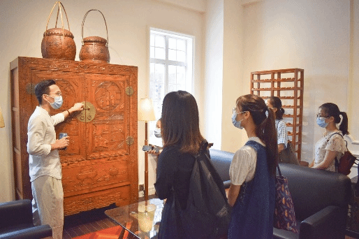 在参观馨园·喜遇东山过程中,何建生经理为本项目团队同学进行了专业导赏。经何经理介绍后,我们了解到喜遇东山的院子里矗立着两栋红砖堆砌而成的家族房。后期对两栋楼的保育过程中,建筑方通过玻璃通道连接起两栋楼,称之为双子楼。两栋楼守望相助、相互呼应,象征着两兄弟互相扶持。双子楼融合了传统与西式的建筑风格,在追求“摩登”形式的骑楼的同时兼顾了传统的建筑结构。