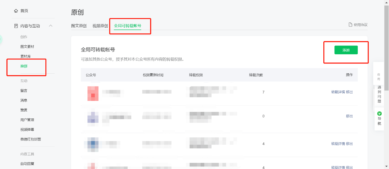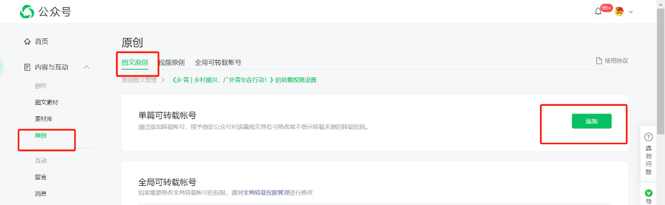 ②全局:点击全局可转载账号后,点击绿色按钮“添加”,输入广外青年公众号ID:gwtwgfw