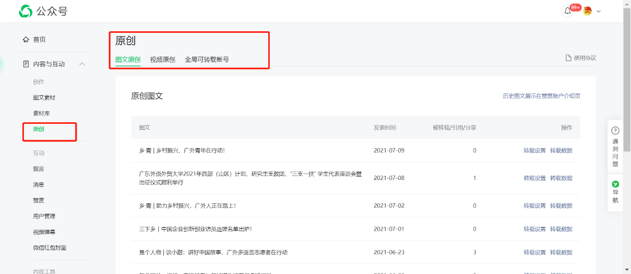 ①单篇:点击图文原创,点击对应的原创图文中的蓝色按钮“转载设置”,跳转后点击绿色按钮添加,输入广外青年公众号ID:gwtwgfwx