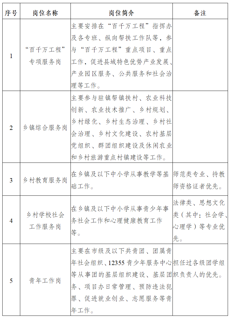“百千万工程”专项服务岗、乡镇综合服务岗、乡村教育服务岗(含“希望乡村教师计划”)、乡村学校社会工作服务岗(含“一校一社工”)、青年工作岗。(详见附件2)