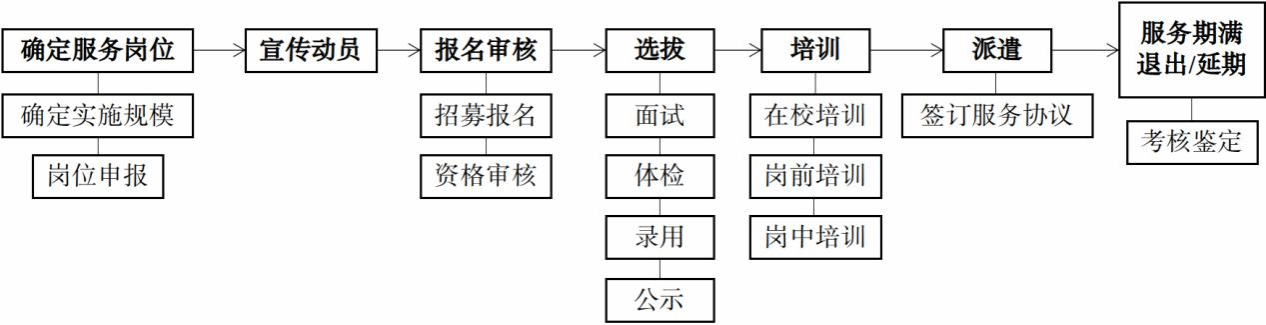 公开招募、自愿报名、组织选拔、集中派遣