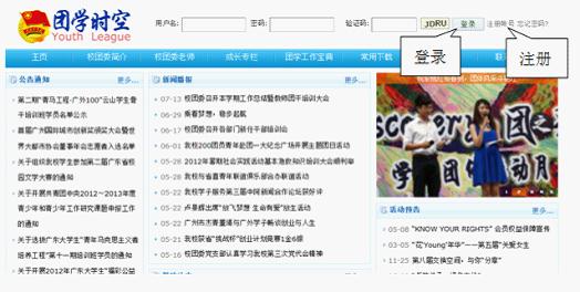 一.注册与登录:进入“团学时空”网站的首页,若第一次使用,请点击“注册”按钮,进入注册界面。按所有要求项后就可以完成注册。注册完毕后输入用户名和密码登陆。