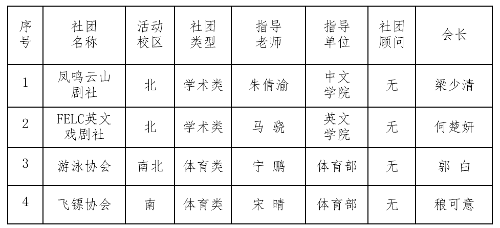 根据学校关于学生社团管理相关规定,以及《关于申请成立学生社团的通知》要求,申请注册成立新社团须提交相关筹备立项材料、通过成立答辩会、筹备招新和会员大会(成立大会)等程序,现校团委经过审核筹备立项材料并进行成立答辩会,拟批准凤鸣云山剧社等社团进行筹备成立程序。现将通过筹备申请的社团名单公布如下: