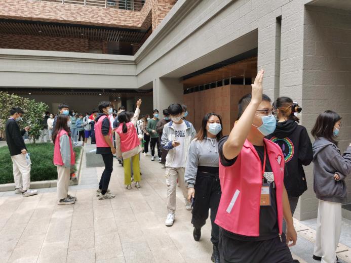 8点40分,核酸检测工作准备就绪。在医务人员到达后,志愿者迅速维护现场秩序,为核酸检测工作保驾护航。在大规模人群核酸检测的情况下,志愿者工作有条不紊,确保核酸检测工作高效开展。检测准备区前后,志愿者们尽职尽责,热心指引。他们的身影穿梭在校道上与教学楼中,成为今天寒冷早晨里的一道暖心的风景线。