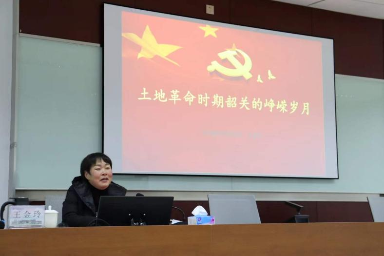 韶关市党校委员王金玲为学员们讲述土地革命时期红军在韶关的峥嵘岁月。她将红军在韶关的战略分为转战、穿过、游击三大部分,深入浅出地为学员剖析红军胜利的原因,并鼓舞学员们学习长征事迹、树立艰苦卓绝的奋斗意识。