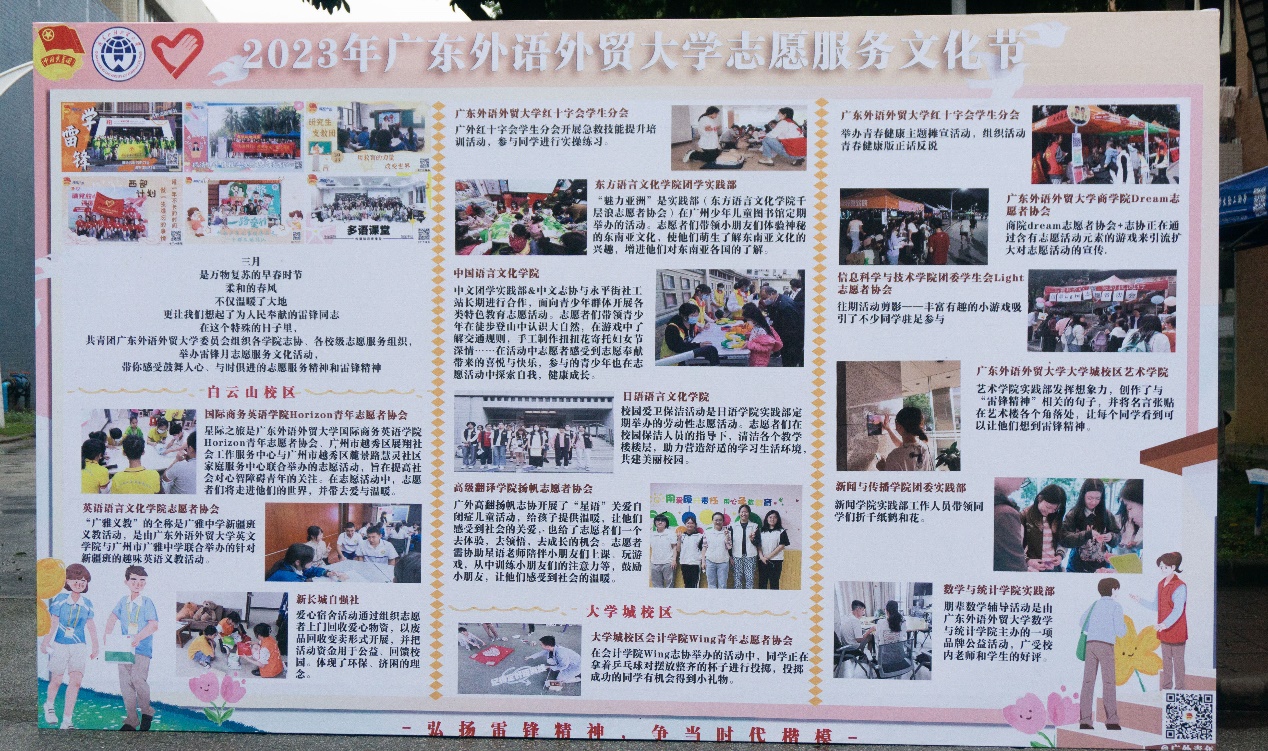 2023年是毛泽东等老一辈革命家为雷锋同志题词的60周年,为大力弘扬雷锋精神,引导广大青年学子继承优良传统,努力形成向上向善、诚信互助的社会风尚。3月30日,校团委与各学院志协、校级志愿组织联合开展了主题为“弘扬雷锋精神、建功志愿广外”的志愿服务文化节活动。
