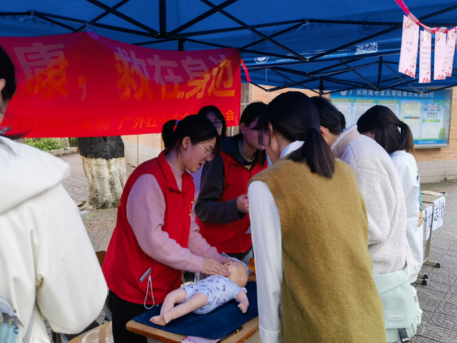 “同心携手,预防艾滋”。为了更好地普及性教育及安全知识,广东外语外贸大学红十字会学生分会(简称“广外红会”)开展了跨越危险地带、青春健康知识知多少?、我想对“你”说等活动。同学们参与跨越危险地带的活动时,需根据艾滋病的传播特点和方式,判断卡片上的行为,将卡片放在两个不同区域。除此之外,为更好地普及急救知识,广外红十字会学生分会联合惠民应急救援队举办了心肺复苏理论学习与实操活动,通过现场模拟演练与知识科普,让参与的同学们了解到心肺复苏的具体流程与相关细节性操作,进一步提升了同学们的急救知识储备。