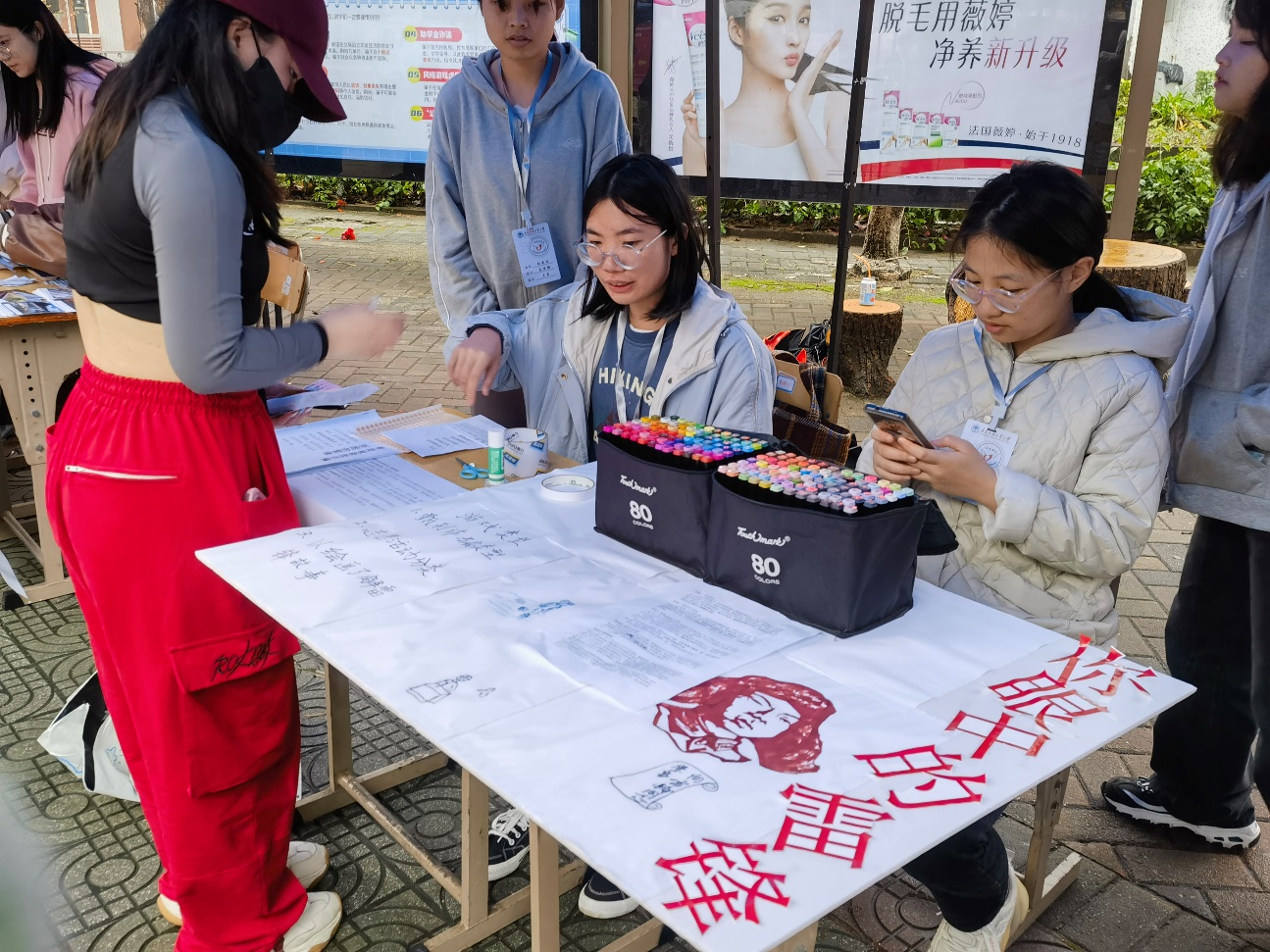 校团委青年志愿者指导中心在摊位上宣传西部计划志愿活动和第三届“幸你所信”长期成长陪伴类志愿活动,为参与者分发集结卡进行贴纸收集。除此之外,摊位上还设有填涂雷锋油画的活动,广大师生积极参与,共同为雷锋画像添色彩,使其更增一分韵味。