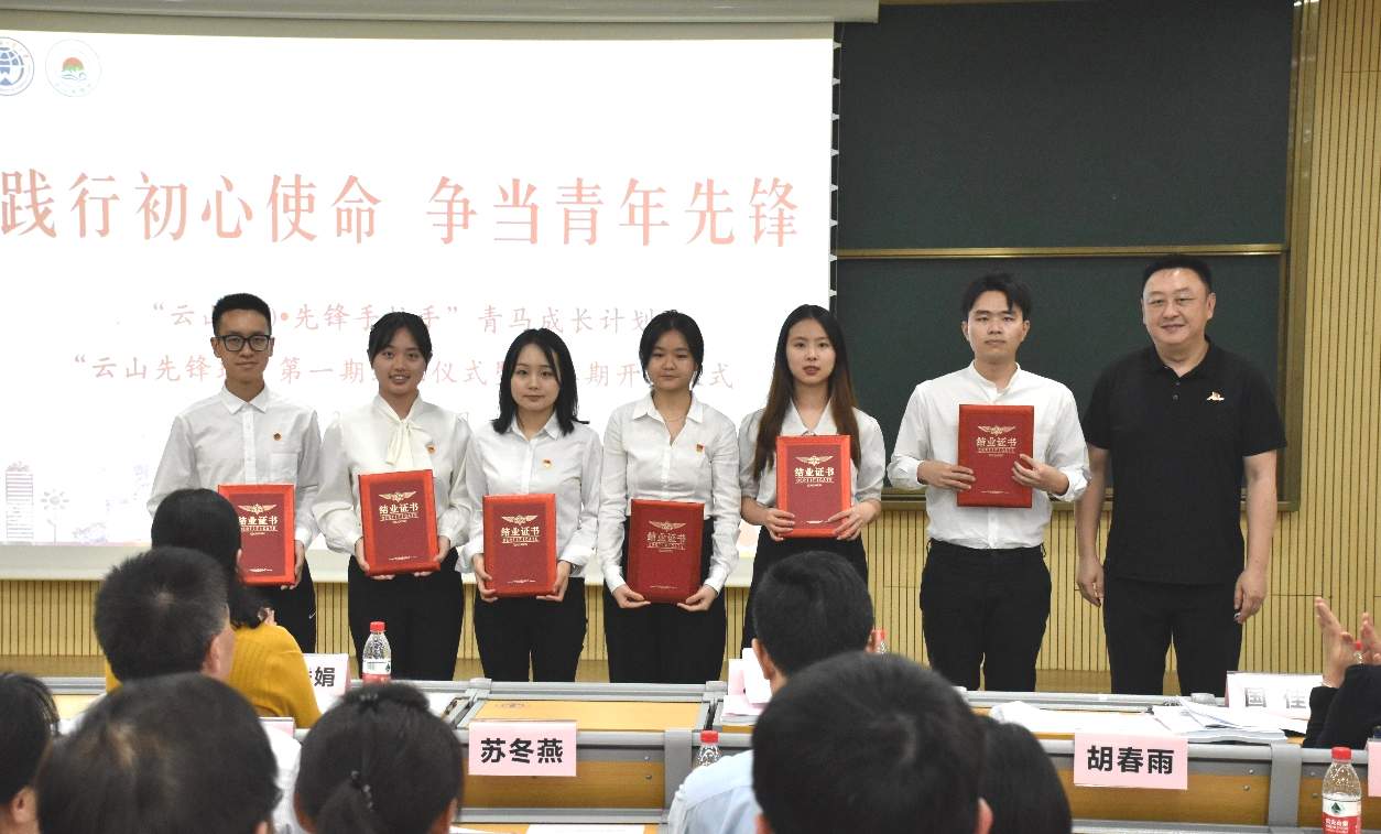 本网讯 为深入贯彻落实习近平新时代中国特色社会主义思想,创新党建带团建新模式,落实云山先锋工程和灯塔工程青年马克思主义培养工程,我校实施了“云山100·先锋手拉手”青马成长计划,设立了“云山先锋班”。4月6日下午,“云山先锋班”第一期结业仪式暨第二期开班仪式在白云山校区第一教学楼南楼的桃李讲堂举行。校党委副书记唐锐、党委组织部部长黄秀娟、党委学生工作部部长国佳、校团委书记刘郎、各学院主要负责人及云山先锋班同学参加会议。