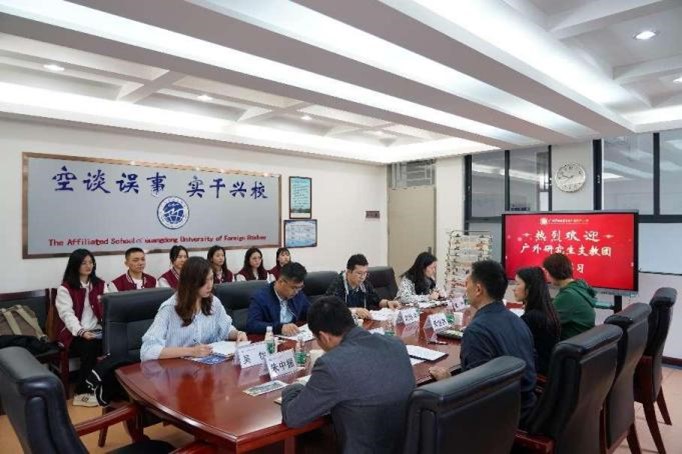 2023年4月10日上午,校团委联合白云外国语中小学举行广东外语外贸大学第九届研究生支教团实习见面会。白云外国语中小学党支部书记兼校长方建军、副校长黄哲昙、校长助理兼校办主任朱中振、副主任陈丽丽、小学部教学处主任唐龄、我校团委书记刘郎、副书记赵继伟、专职团干吴怡以及广外第九届青燕研支团全体成员参加本次会议。