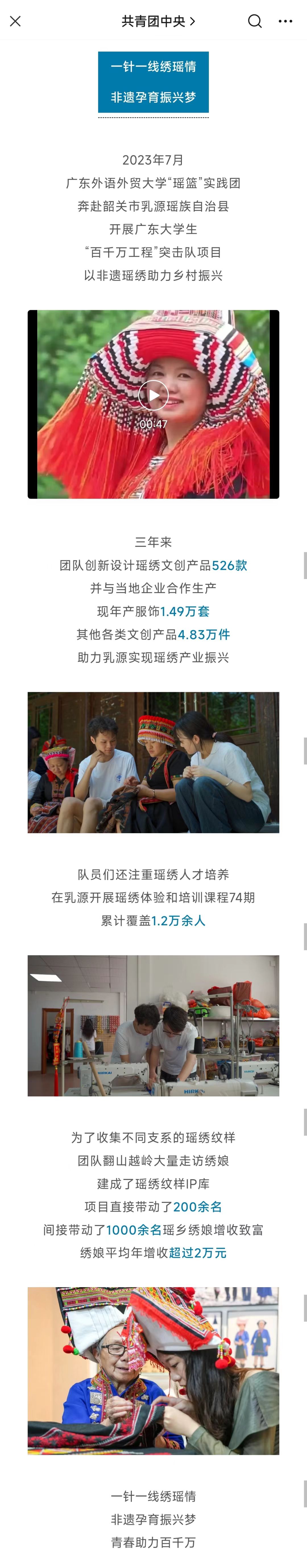 广东外语外贸大学“瑶篮”实践团奔赴韶关市乳源瑶族自治县开展广东青年大学生“百千万工程”突击队行动,以瑶族刺绣为核心,通过“线下走访+线上设计”的方式,深入瑶乡大地,创新设计瑶绣文创产品、建成瑶绣纹样IP库、开展瑶绣体验和培训课程,直接带动200余名,间接带动1000余名瑶乡绣娘增收致富,以非遗瑶绣助力乡村振兴!