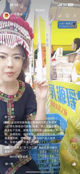 经贸学院刘耀庭作为直播志愿者,他分享道:“为韶关乳源的农产品代言,宣传广外在乡村振兴方面的行动和贡献,呼吁更多青年关注并积极投身于广东青年青年“百千万工程”突击队行动中来。我会继续开展直播助农,为乡村振兴贡献自己的青春力量。”