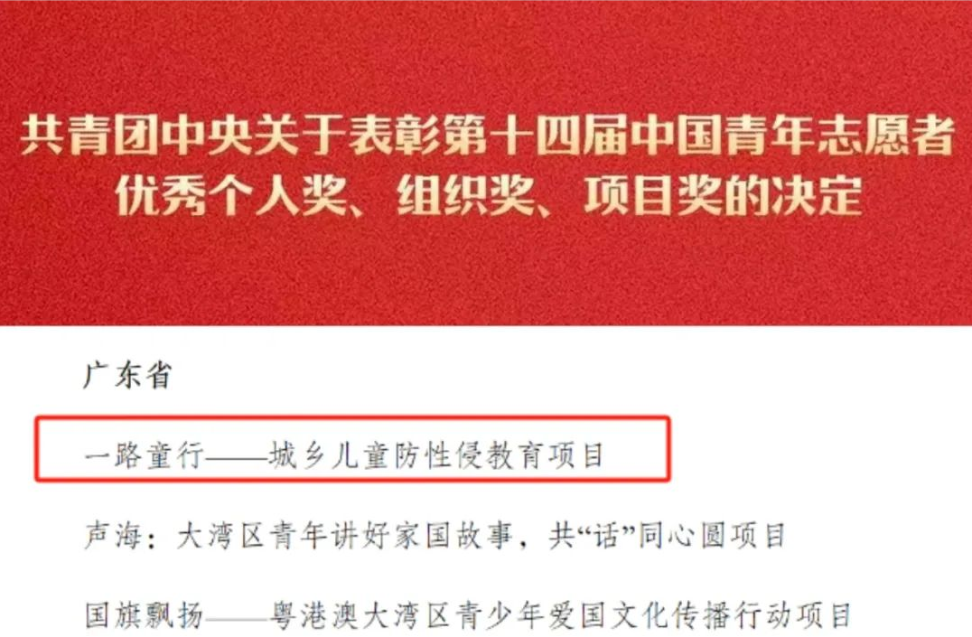 本网讯 今天,是第38个国际志愿者日。共青团中央发布了《关于表彰第十四届中国青年志愿者优秀个人奖、组织奖、项目奖的决定》。我校“一路童行--城乡儿童防性侵项目”荣获”第十四届中国青年志愿者优秀项目奖”。我校首次获得该奖项,全国共100个项目获评。