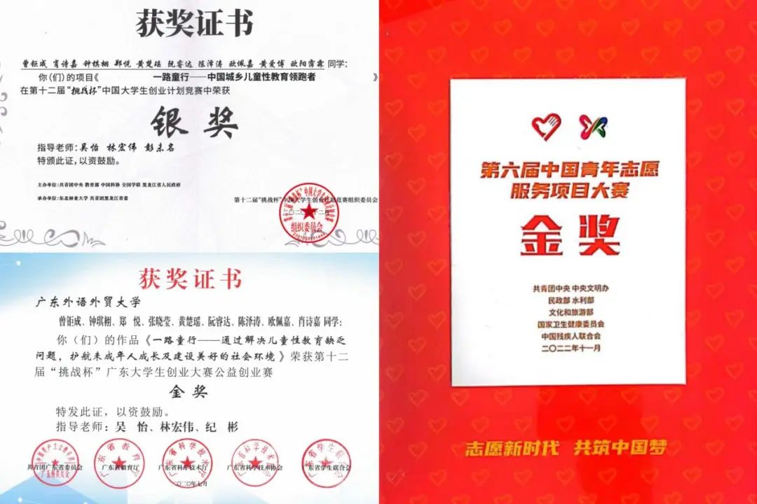 六年来,项目荣获第六届中国志愿服务项目大赛金奖、“挑战杯”中国大学生创业计划竞赛银奖、团中央“七彩四点半”志愿服务示范团队、“挑战杯”广东大学生创业计划竞赛金奖、中国国际“互联网+”大学生创新创业大赛广东省分赛银奖、广东省“益苗计划”重点培育项目等数十项国家级、省级奖项。项目先后被共青团中央、中国青年志愿者、中国青年网、广东志愿者、广东电视台等多家主流媒体的宣传报道,获得了社会各界的广泛好评。