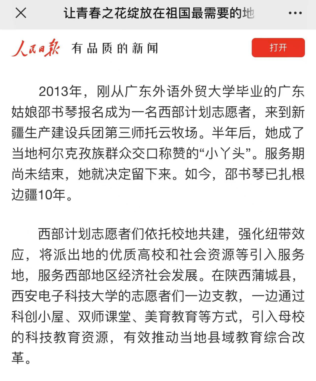 人民日报今日报道我校西部计划志愿者邵书琴的事迹