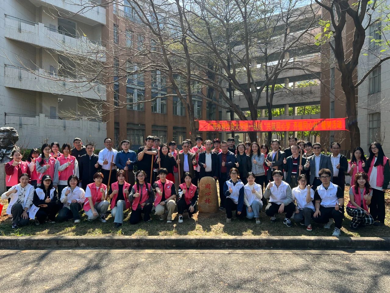 校长闫相斌教授,副校长申明浩教授、党办校办、统战部、校团委、总务后勤部、校友处等相关部门的老师,以及广外“百千万工程”突击队成员、“绿美广东”志愿服务队志愿者、校团委和学生会骨干、多语党支部成员、留学生、教职工一同参加植树活动。此次活动种植的沉香树苗由李向明先生、李雅清校友向学校捐赠。