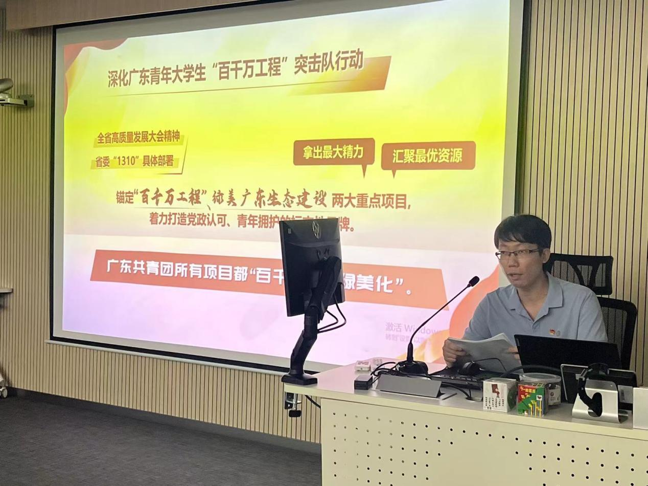 团省委学校部干部梁兆铭老师为参会人员开展“百千万工程”突击队行动工作培训。梁兆铭指出,“百千万工程”突击队行动,是学校共青团战线全年重点工作,学校团委要高位推动、聚焦统筹、同频共振,动员各学院发挥专业优势,推动人才下沉、科技下沉、服务下沉,用好平台和工作站,打造品牌项目,培育兴乡青年,助力地方经济高质量发展。