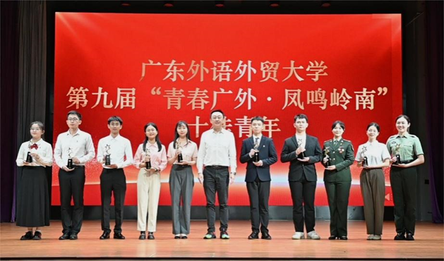 经过评委综合评分,英文学院陈慧珊、商英学院吴楚琪、商学院胡叙妍、东语学院韦雅东、亚非学院曾志琦、法学院关咏芯、教育学院陈懿婷、信息学院郑永强、公管学院王梓旭、数统学院邓斯达荣获了“十佳青年”的称号,唐锐书记为各位获奖者颁奖。