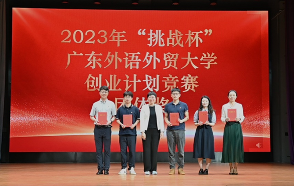 活动现场还颁发了2023年“挑战杯”广东外语外贸大学创业计划竞赛团体奖和2023年广外青年大学生“百千万工程”突击队行动暨暑期“三下乡”社会实践活动优秀组织单位奖。国佳部长为经济贸易学院、金融学院、法学院、中国语言文化学院、商学院颁发“挑战杯”团体奖。