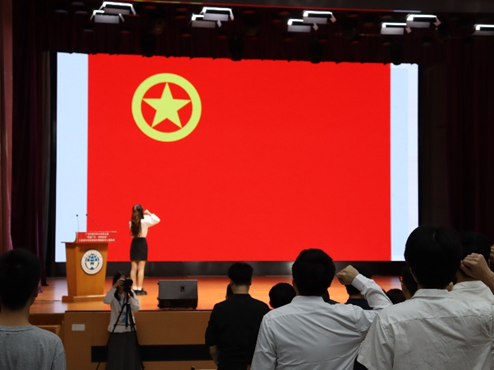 答辩结束后,举行新团员入团仪式。仪式开始,全体起立并奏唱中华人民共和国国歌。唐锐书记、各部门老师与老团员代表为新团员们颁发团徽徽章。团员代表吕彩燕同学带领新团员进行庄严宣誓。