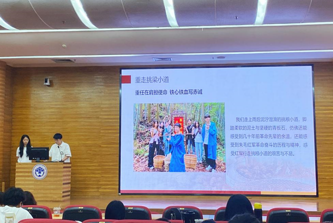 随后,参与井冈山研学的队伍代表向大家分享所见所闻所感。团队成员详细讲解了革命年代动人的英雄事迹,也分享了收获与心得。学员们结合井冈山精神及新时代青年的使命与担当,号召全体同学要肩负起任与使命,走好属于我们这一代人的长征路。