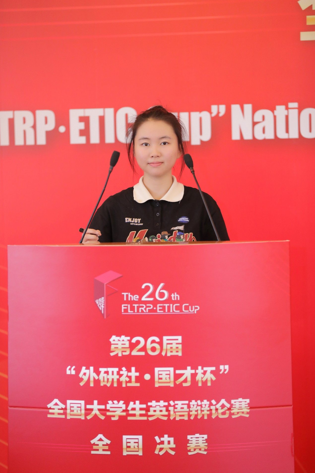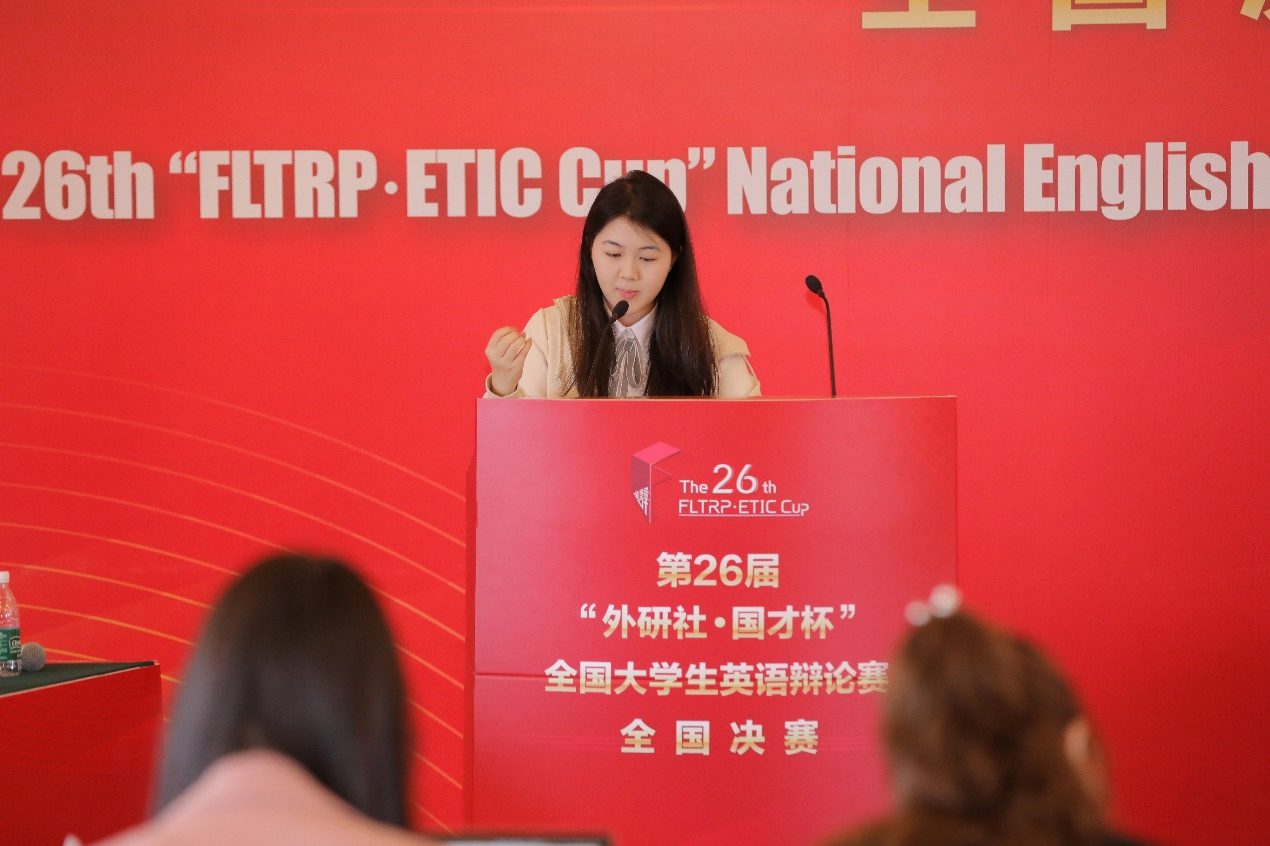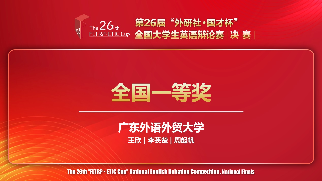 本网讯 6月9日-6月11日,第26届“外研社•国才杯”全国大学生英语辩论赛总决赛在北京外研社大厦举行。全国400多支队伍、千余名辩手及指导老师参加了该赛事,经过华东、华南、华西、华北四大赛区的复赛,总计141支队伍晋级全国总决赛。我校英语辩论校队队员李苌楚(高翻学院)、周起帆(亚非语言文化学院)在校队指导老师王欣的带队指导下参加了华南大区赛及全国总决赛的激烈角逐,最终闯入四分之一决赛(位列全国16强),荣获全国总决赛一等奖。此前,李苌楚和周起帆和广外校园选拔赛中获得冠军,在华南大区赛中获得一等奖、最佳辩手称号。