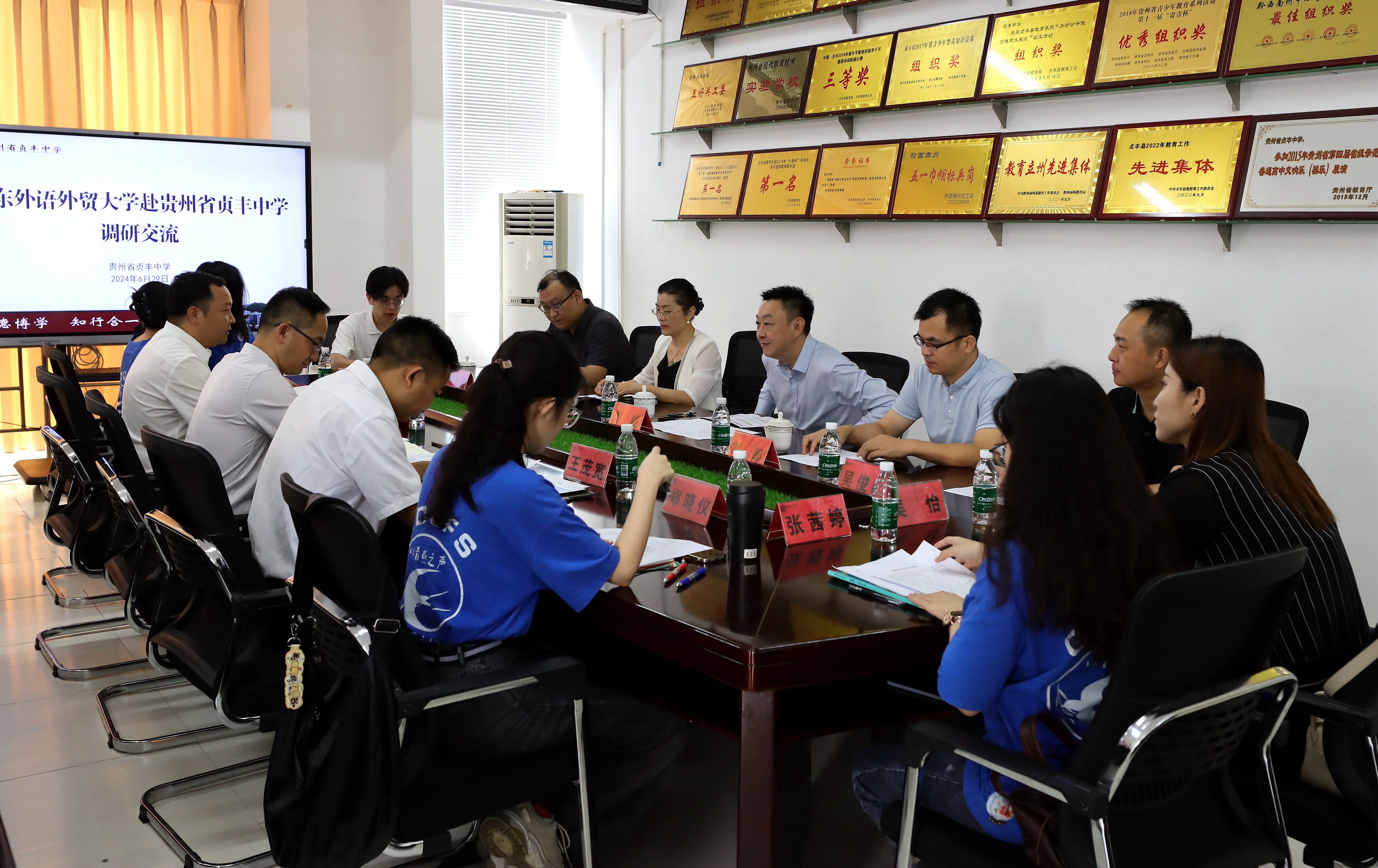 贞丰县教育局局长保正权,共青团贞丰县委书记黄泰,贞丰中学党总支书记、副校长王茂宽及党政班子、我校慰问团成员、第九届广外研支团教师参与会议。会上,双方相互交流西部少数民族地区所面临的教育困境,就如何改善贞丰县目前面临的教育教学困境展开交流讨论。
