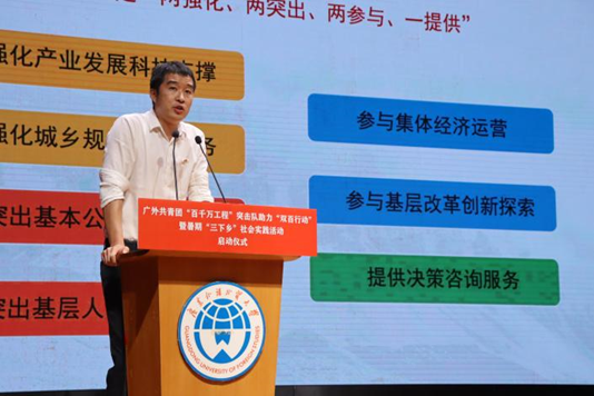 本网讯 为深入贯彻习近平总书记五四重要寄语精神,全面落实省委“百县千镇万村高质量发展工程”部署,引导广大青年大学生积极投身到中国式现代化的火热实践之中,近日,校团委于大学城校区举办了广外共青团“百千万工程”突击队助力“双百工程”暨暑期“三下乡”社会实践活动启动仪式。