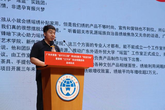 校团委“瑶篮”实践团是2023年暑期“三下乡”社会实践活动全国重点团队、全国优秀团队,广东省“百千万工程”突击队示范项目、省级重点团队。团队分享了项目的发展历程,通过开创“高校+基地+工坊+绣娘”的非遗乡村振兴新模式,解决非遗推广与非遗传承人收入等问题,以非遗瑶绣织出乡村振兴新样态。团队在实践中克服了交通不便与语言不通等困难,以青春之力,赋能瑶绣发展,助推瑶乡实现乡村振兴。