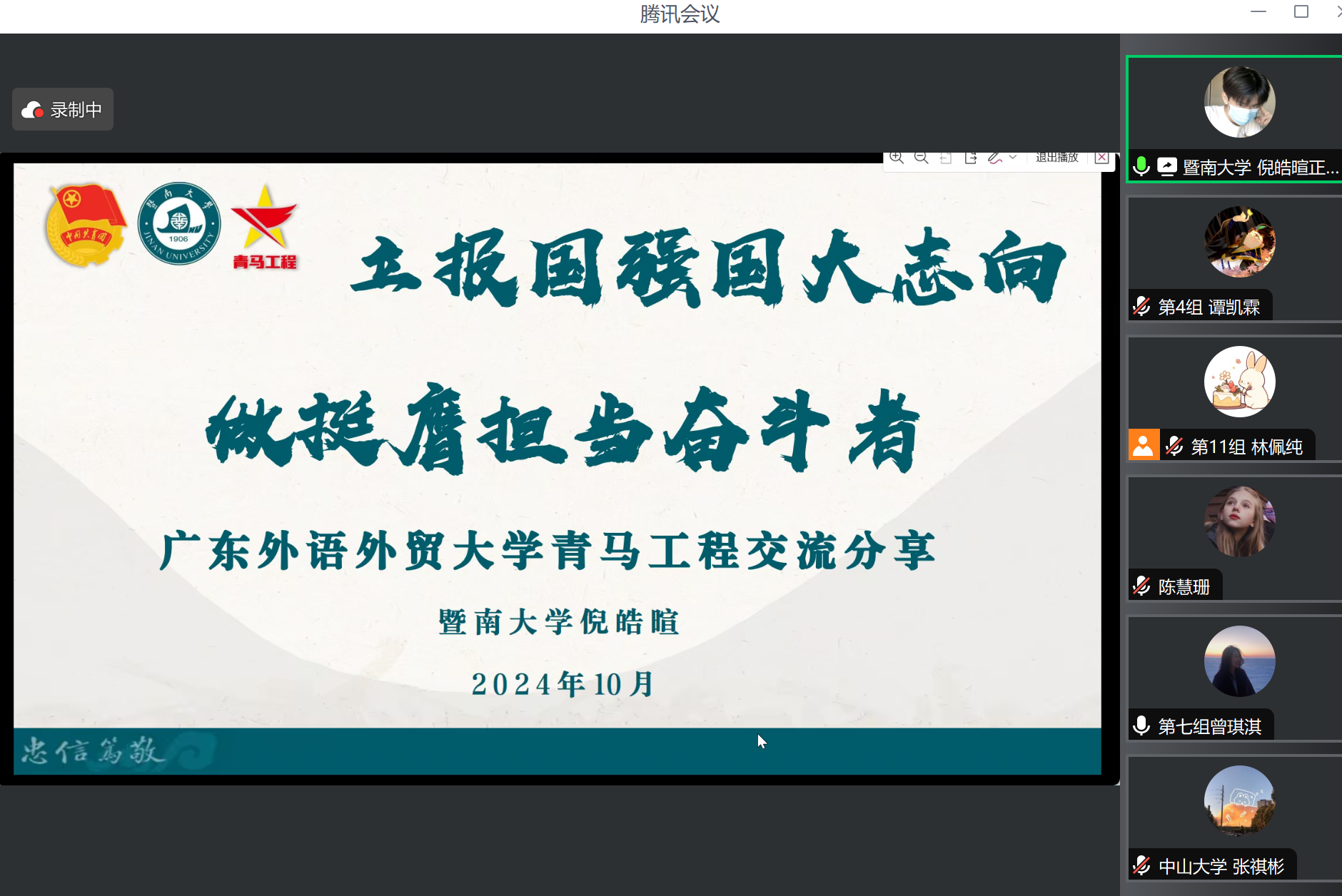 而最引人注目的当属朋辈交流环节。在这一环节中,来自中山大学的张祺彬同学和暨南大学的倪皓暄同学作为广东省青马班的优秀学员代表,进行了精彩的交流分享。张祺彬同学以“青春为中国式现代化挺膺担当”为主题,深入阐述了新时代青年如何在团学工作中发挥引领作用,成为有理想、有担当的团学骨干。他结合自身团学工作经历,分享了如何在思想引领、团学改革、业务能力提升及创新实践等方面下功夫,为青年学子树立了榜样。