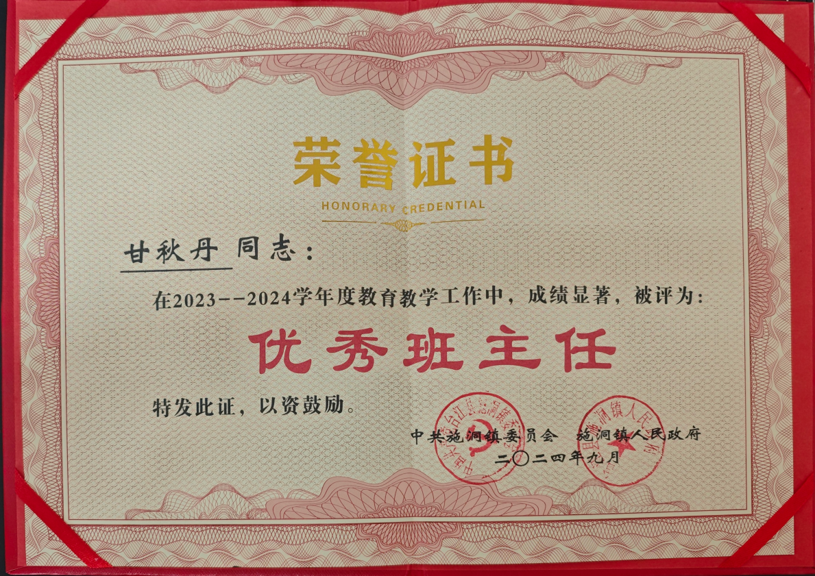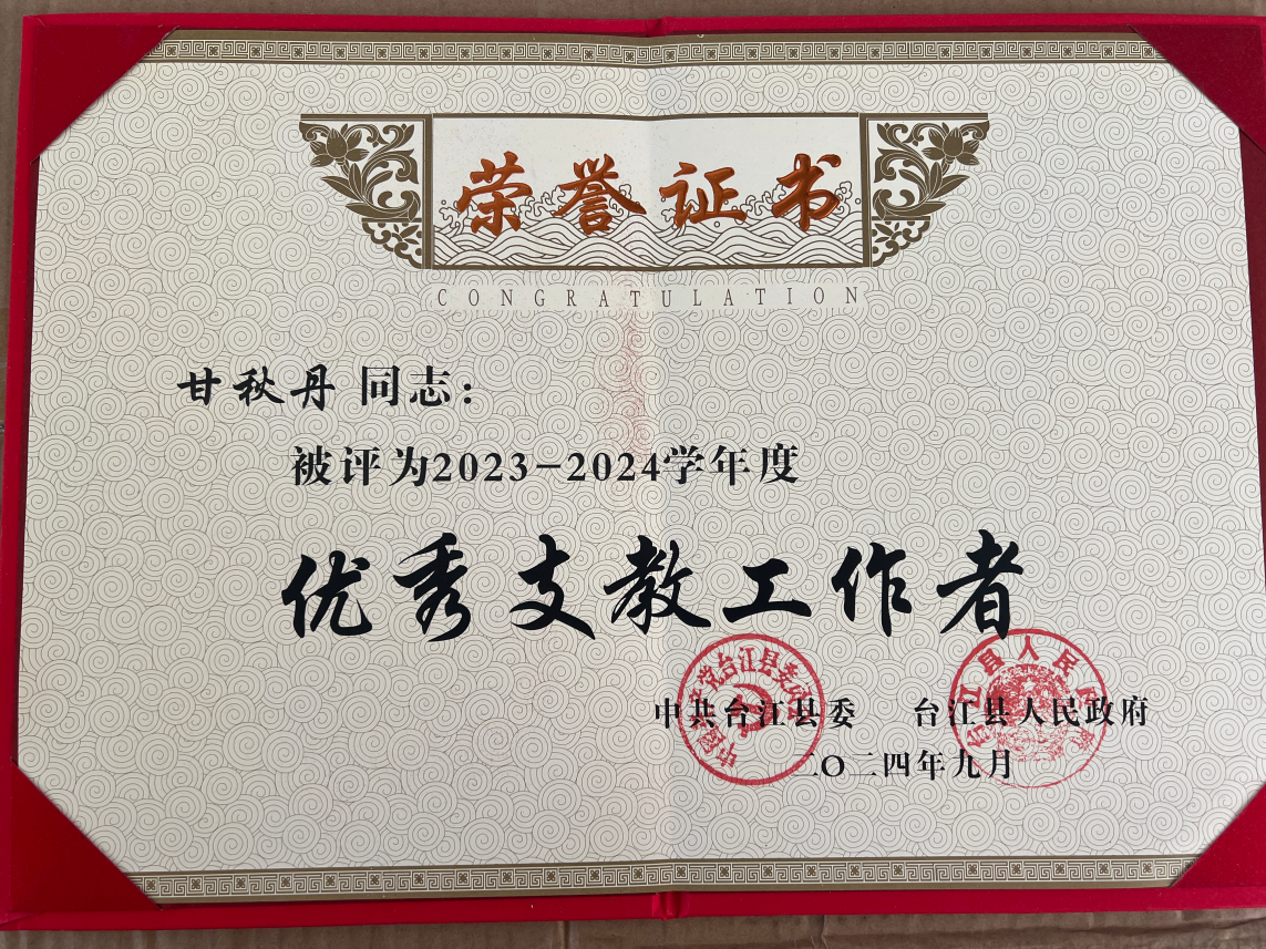 近日,贵州省黔东南州教育局发布了2024年教师节拟推荐通报表扬优秀个人和先进单位名单,我校马克思主义学院研究生甘秋丹被评为2024年贵州省黔东南州“优秀支教工作者”。与此同时,甘秋丹还获得台江县“优秀支教工作者”、台江县“优秀志愿者”、施洞镇“优秀班主任”荣誉称号,其所带班级荣获2024年台江县“先进班集体”荣誉称号。