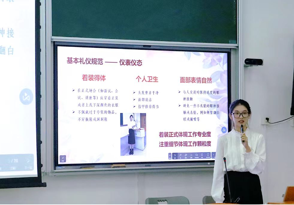 校团委学生兼职副书记、中文学院22级团总支书记、朋辈导师协会负责人谭秀薇结合自身实际,围绕基本礼仪规范、人际交往礼仪、会议活动礼仪等方面为新任干事作了全面的礼仪培训。