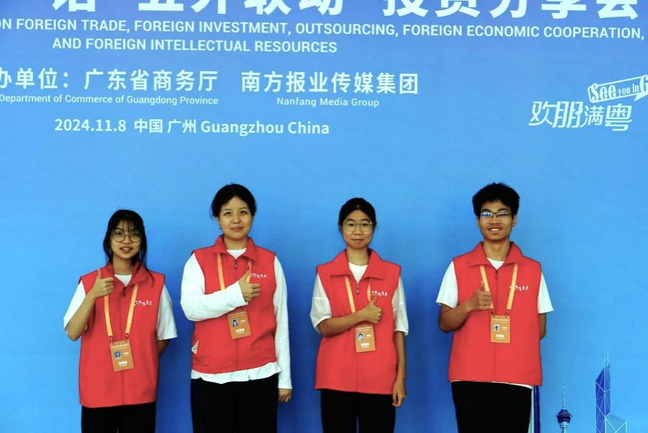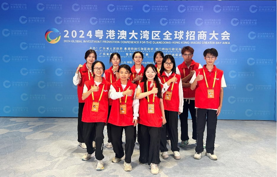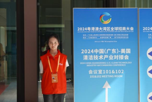 商英学院的邱蔓在此次活动中担任会务指引的志愿者,能够参与2024粤港澳大湾区全球招商大会的志愿服务,她感到无比荣幸。在志愿服务过程中,她遇到不少外国嘉宾来询问,能运用英语专业知识为其解答和指引,让她在帮助他人的同时收获了成就感与幸福感。“特别幸运的是,作为‘湾区之夜’小组的一员,我见证了来自世界各地的嘉宾交流合作,开拓了视野,让我对充满无限可能的未来更加憧憬。感谢学校提供的这个机会,这次志愿经历不仅丰富了我的人生经验,还让我见识到更广阔的世界。”