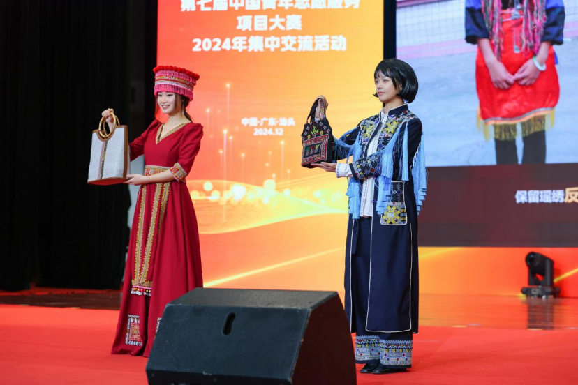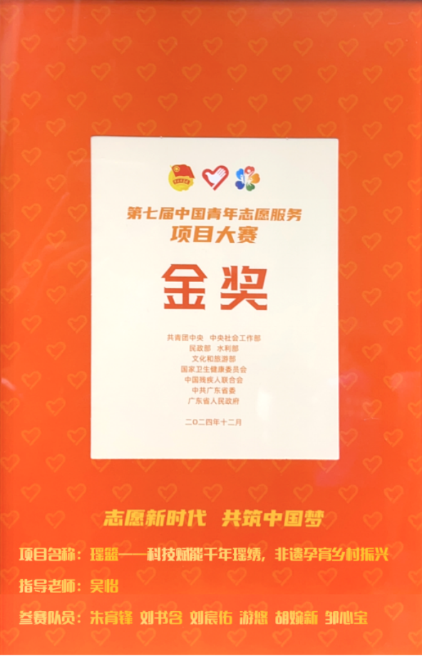 本网讯 2024年11月30日至12月1日,由共青团中央、中央社会工作部、民政部、水利部、文化和旅游部、国家卫生健康委员会、中国残疾人联合会和中共广东省委、广东省人民政府联合主办的第七届中国青年志愿服务项目大赛全国赛终评活动在汕头举办。我校“百千万工程”突击队项目“瑶篮——科技赋能千年瑶绣,非遗孕育乡村振兴”荣获大赛金奖,并在闭幕式中作为优秀作品进行展演。这是我校继2022年首次获得大赛金奖后,蝉联该赛事金奖,是本届项目大赛广东省获得的两个金奖项目之一。