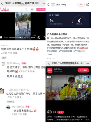 广外青年志愿者们热情细致的服务得到了组委会和参赛选手的一致认可。众多跑友自发拿起相机摄影记录完赛物品领取瞬间并分享自身真实感受,在“微信视频号”“小红书”“哔哩哔哩”等多种新媒体平台上广泛传播,引发热议,突出展现了广外青年的靓丽风采。
