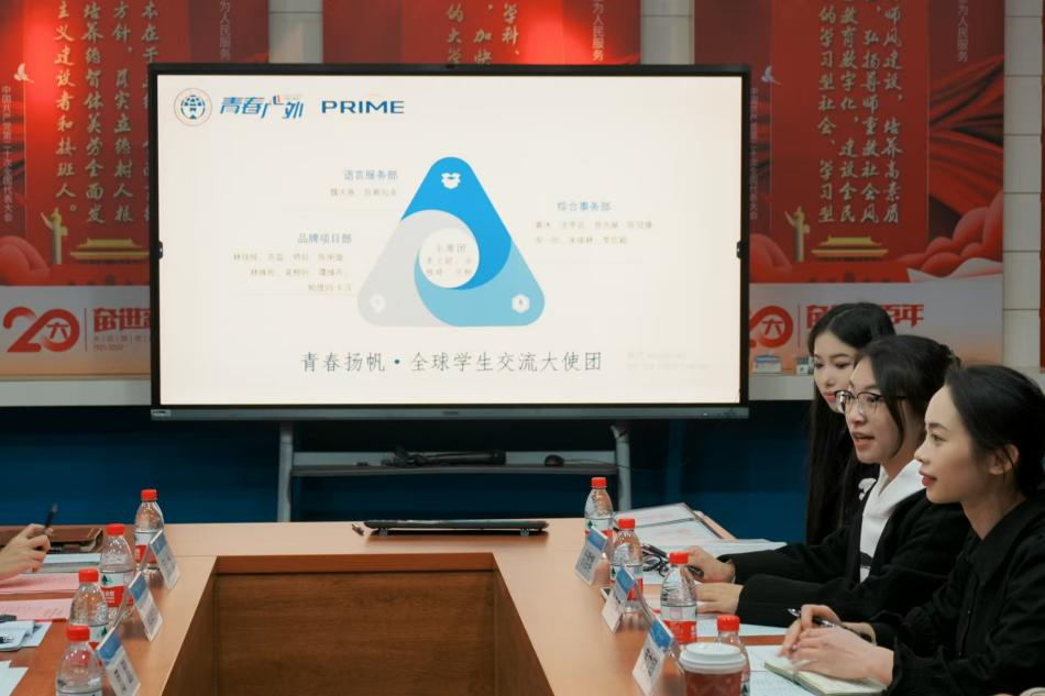 随后,主席团成员麦文疑详细汇报了第一届“青春扬帆·全球学生交流大使团”的组织架构和成员组成情况,强调了成员们基于不同专业背景、语言能力和学生骨干经验,将充分发挥自身优势,致力于将大使团建设成为高水平多元化稳发展的学生组织。