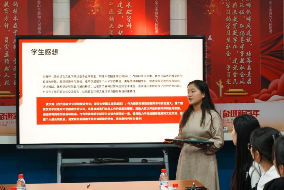 同时,主席团成员何畅围绕大使团前期工作进行总结,并对团队未来的发展方向提出了明确的规划。她提到,成员们将紧密围绕学校外事工作的实际需求,勇于创新,不断丰富活动形式与内容,全方位展示广外学生的国际视野与卓越风采,进一步提升团队影响力。