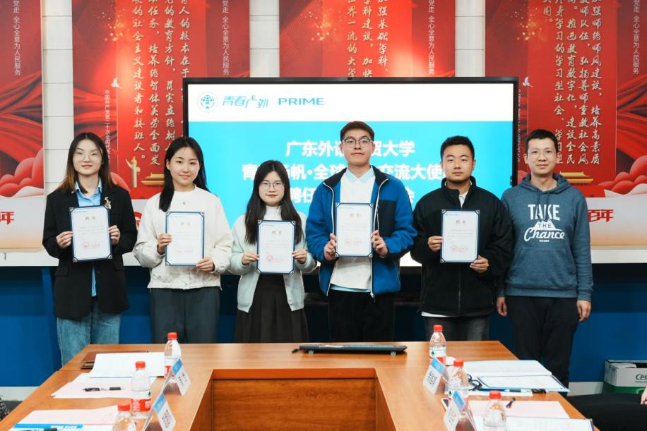 1月6日下午,广东外语外贸大学“青春扬帆·全球学生交流大使团”聘任仪式暨交流会在白云山校区六教B106室召开。校团委刘郎书记、国际部周鹏部长、陆露副部长、校团委赵继伟副书记,以及团队指导老师吴怡、姚恺璇,第一届全球学生交流大使团成员参加会议。