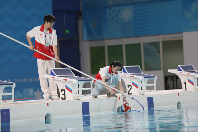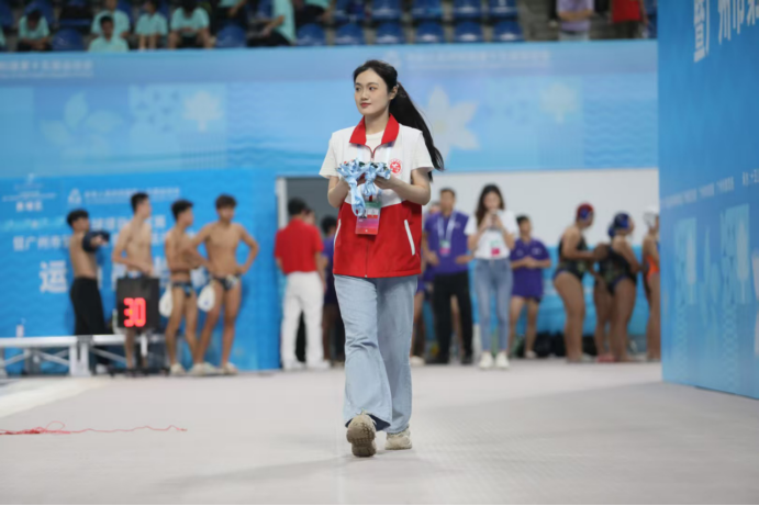 “很荣幸能参与全运会水球项目测试赛的志愿服务。在本次工作中,我主要负责更换比赛项目牌和打捞出界水球,任务虽不复杂,却处处需要留心。真正站在赛场一角,目睹运动员们在水中奋力拼搏,耳边回响着观众席上此起彼伏的掌声与欢呼,我愈发深刻地体会到:每一场比赛的顺利进行,都离不开无数志愿者与工作人员的默默守护。这段经历不仅让我初步了解了全运会赛事服务的流程,也让我结识了一群充满热情、团结协作的‘小海豚’伙伴。期待在未来的正式赛中,我们能继续以‘小海豚’的微光,点亮更多值得铭记的精彩瞬间。”