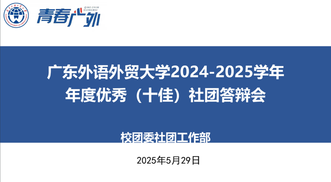 本网讯 2025年5月29日下午,广东外语外贸大学学生社团工作部举办了一场精彩纷呈的年度优秀(十佳)社团答辩活动。此次活动旨在评选出本年度最具影响力和特色的社团,进一步推动校园社团文化的发展与繁荣,为同学们搭建一个展示社团风采、交流社团建设经验的平台,丰富校园生活,营造积极向上的校园文化氛围。