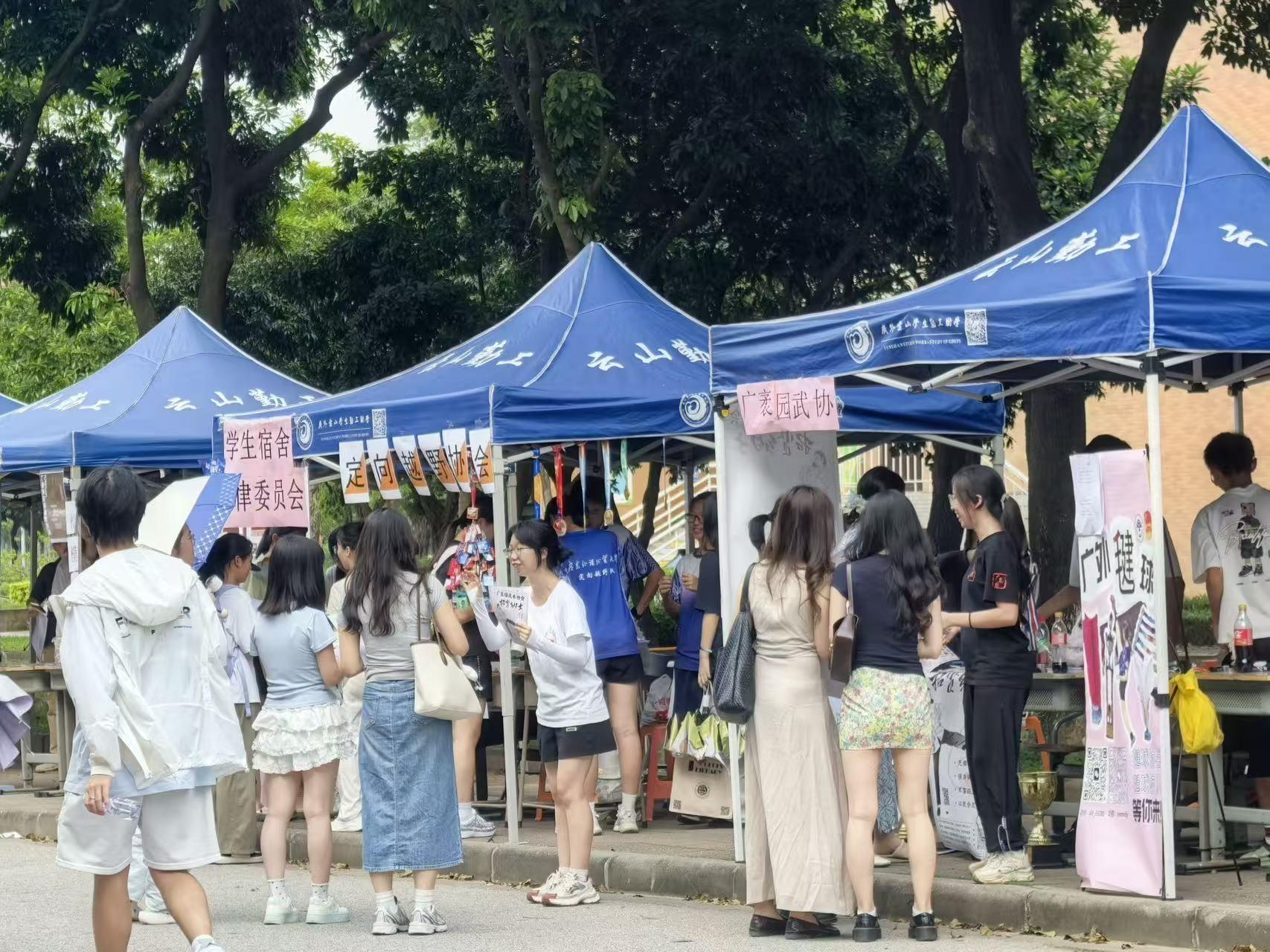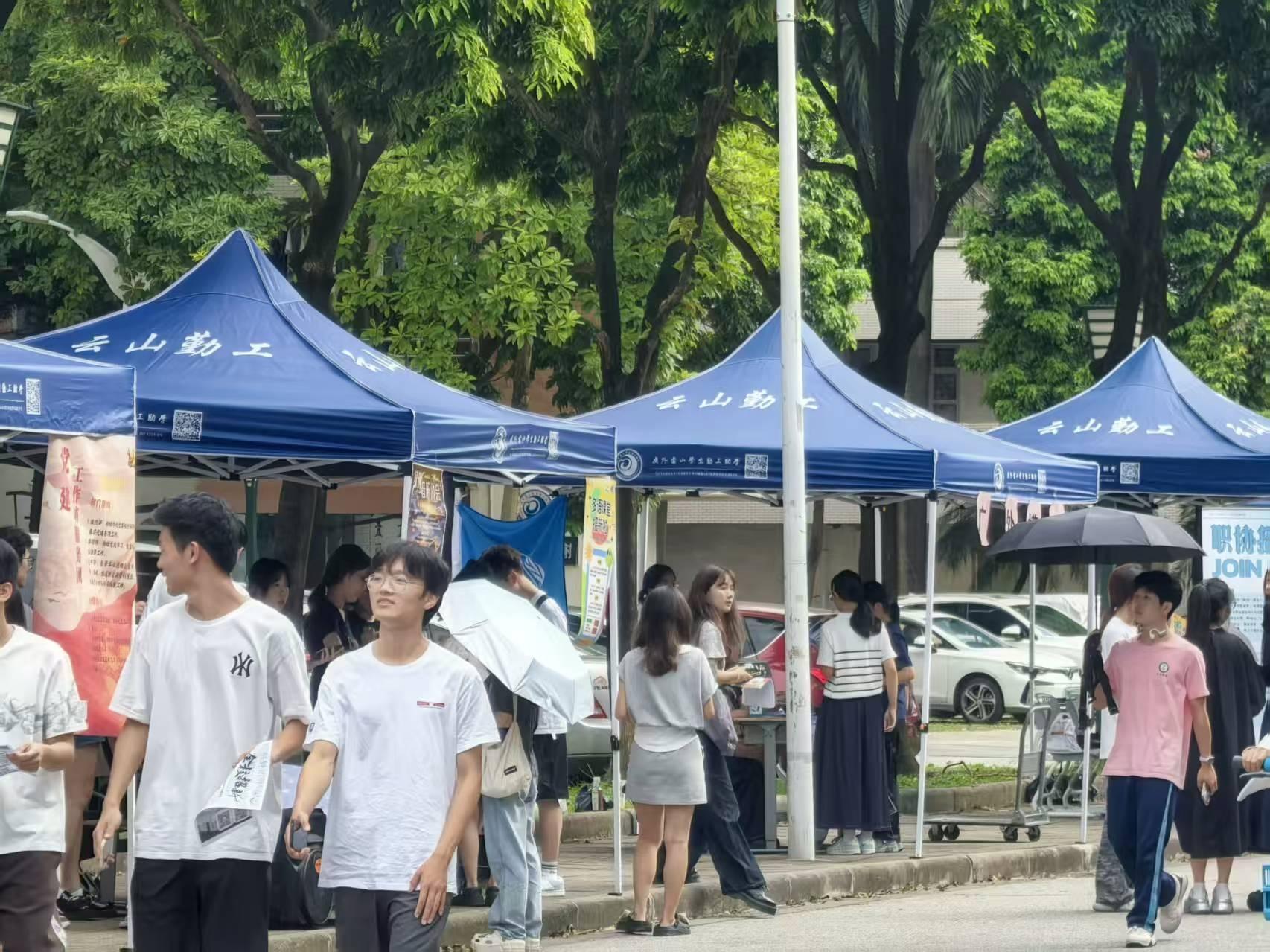 书画协会现场挥墨,“万事胜意”“熠熠生辉”跃然纸上;天文社派出可爱宇航员合影,用图片讲述星空故事;无限动漫协会通过有趣的答题游戏寻找同好,用热爱打破次元边界;广袤园武术协会口号铿锵,一招一式尽显功底。模拟APEC、模拟联合国把国际组织搬进帐篷,双语磋商让新生秒入“国际范”;红十字会、广外岛蛋喵、绿色环保协会现场讲解,用行动传递志愿精神。各体育类社团依旧出彩,棒垒球、乒乓球、羽毛球等运动类协会在场竞技,引得众人连连叫好。